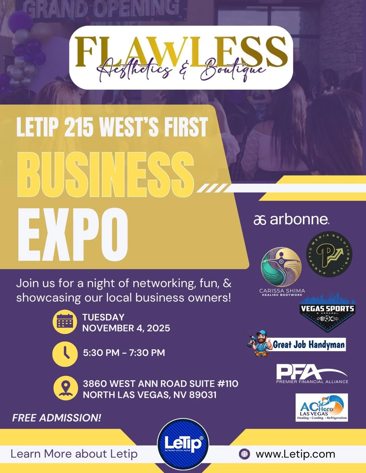 On Tuesday, November 4, 2025, the Las Vegas small business community will come together for an exciting evening of connection, collaboration, and celebration at LeTip 215 West’s First Business Expo, proudly hosted at Flawless Aesthetics & Boutique in North Las Vegas.